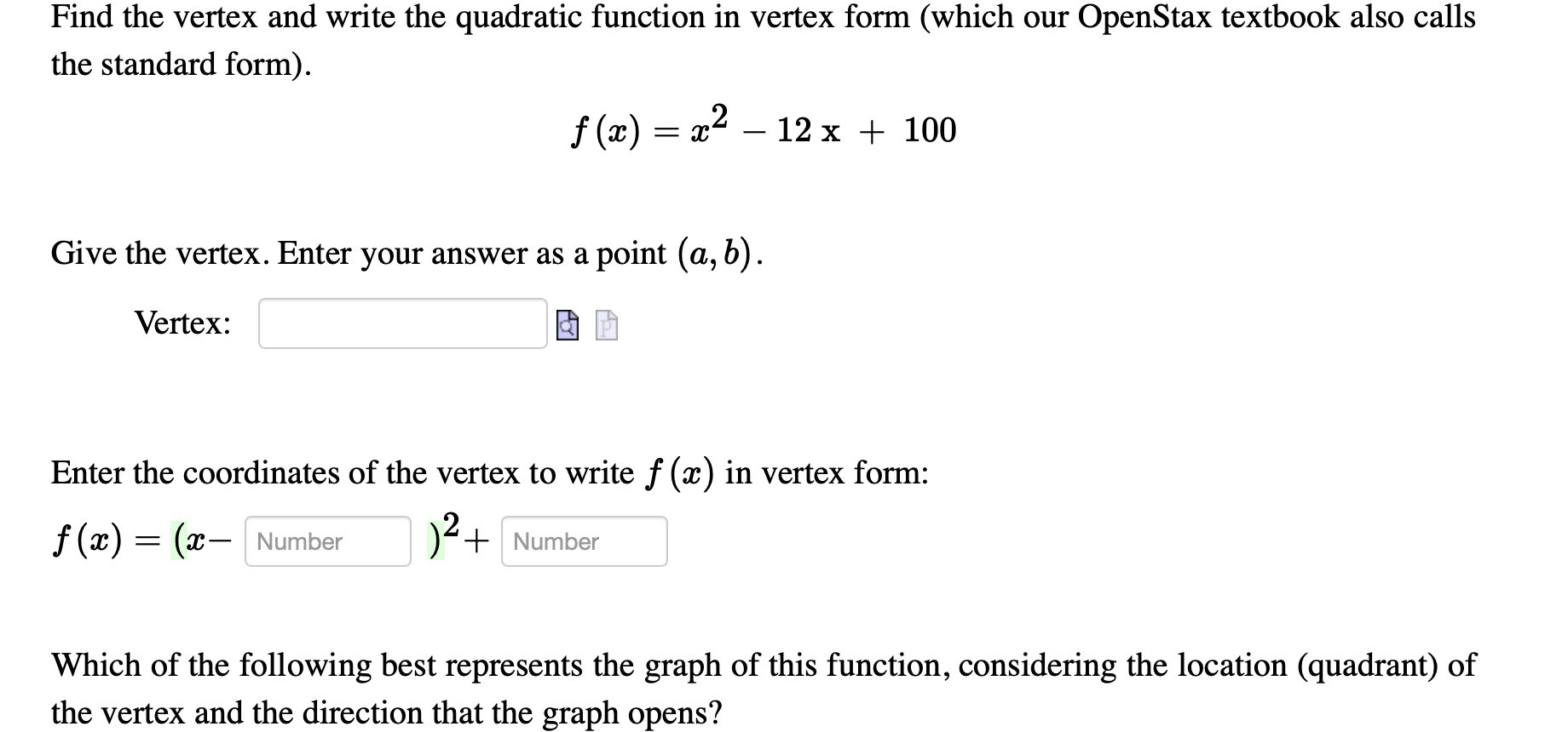 1 from We can write quadratic functions in different ways or forms. The following diagram shows how to use the vertex formula to convert a quadratic function from general form to vertex form. Check our vertex form calculator if you want to find the vertex of a quadratic function in a standard form. • (h, k) is the vertex of the parabola, and x = h is the axis of symmetry. Then, find other points of the function, taking into consideration the axis of symmetry, x=h. Use the html 5 (better viewed using chrome, firefox, ie 9 or above) applet below to explore the graph of a quadratic function in vertex form: The vertex form is a special form of a quadratic function. Use the other given point, (3, 2), to find a.